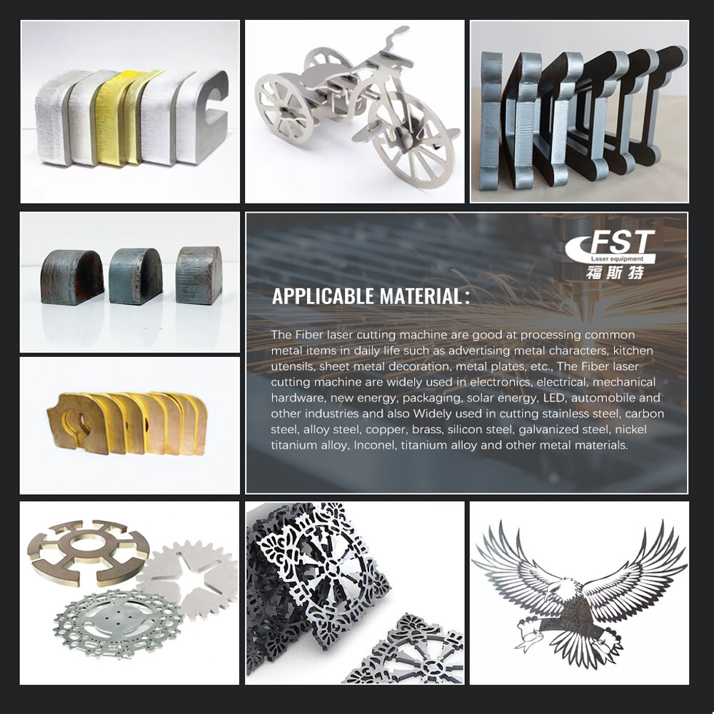 파이버 레이저 절단기는 일상 생활에서 흔히 쓰이는 금속 제품인 광고용 금속 문자, 주방 용기구, 판금 장식, 금속 시트 등 가공에 적합하며, 전자, 전기, 기계 하드웨어, 신에너지, 포장, 태양광, LED, 자동차 및 기타 산업 분야에서 널리 사용됩니다. 또한 스테인리스강, 탄소강, 합금강, 구리, 황동, 실리콘강, 아연도금강, 니켈티타늄합금, 인코넬(Inconel), 티타늄합금 등의 다양한 금속 재료의 절단에도 널리 활용됩니다.